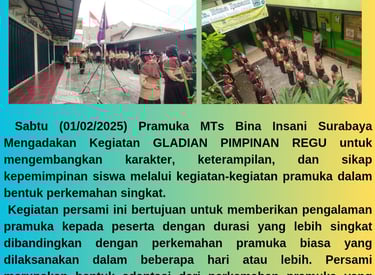 Salah Satu Ekstra Kurikuler Wajib MTs. Bina Insani Surabaya yang menumbuhkan nilai kemandirian, tanggung jawab serta Leadership, untuk peserta didik Madrasah. Hal ini bertujuan agar peserta didik memiliki pengalaman dan juga berkemampuan serta siap menghadapi perjalanan hidup yang lebih menantang, berliku dan terjal kedepanya.