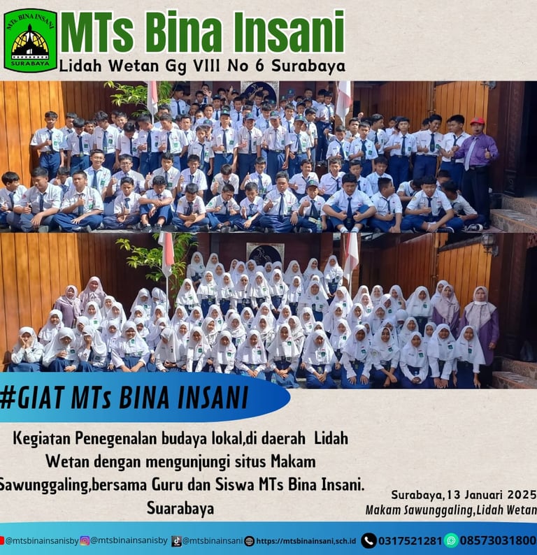 Memahami serta mempelaJari sejarah budaya bangsa, dengan mengunjungi serta belajar langsung dari peninggalan peradaban terdahulu dengan menjadikan hal tersebut sebagai bahan muhasabah dan pembelajaran diri akan sejarah masa lampu yang berada di sekitar MTs. BIna Insani Surabaya